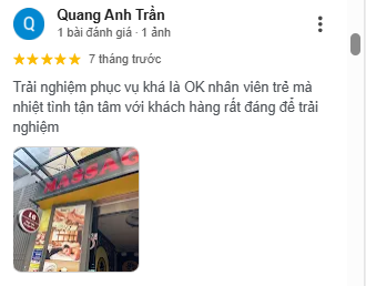 Quang Anh Trần: “Trải nghiệm phục vụ khá là OK nhân viên trẻ mà nhiệt tình tận tâm với khách hàng rất đáng để trải nghiệm.”